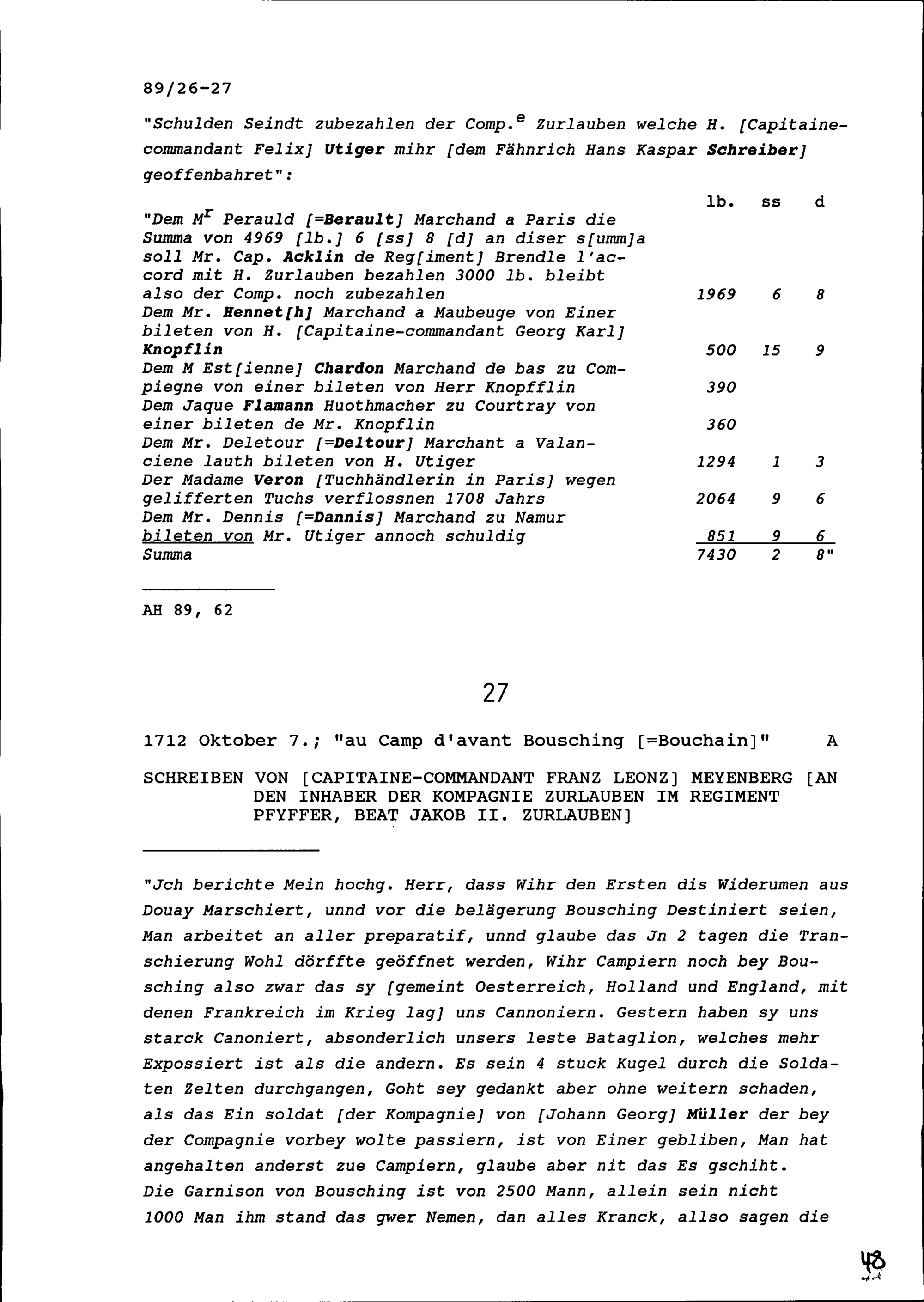 Schreiben von Franz Leonz Meyenberg, Kommandant, an Beat Jakob II. Zurlauben, Inhaber der Kompanie Zurlauben im Regiment Pfyffer