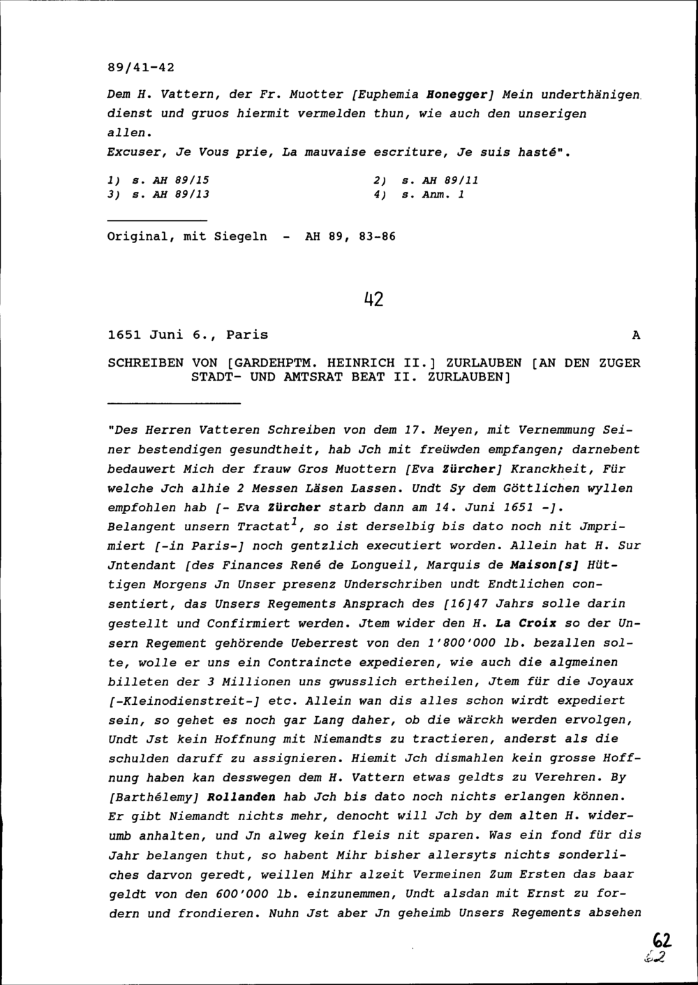 Schreiben von Heinrich II. Zurlauben, Gardehauptmann, an Beat II. Zurlauben, Stadt-...