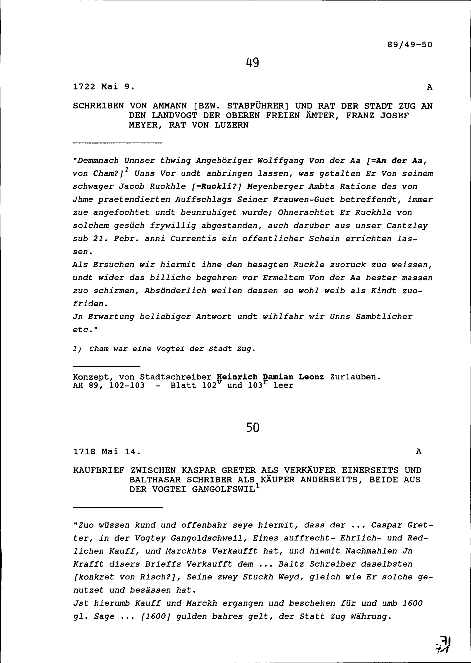 Schreiben des Ammanns (Stabführers) und Rats der Stadt Zug an Franz Josef Meyer,...