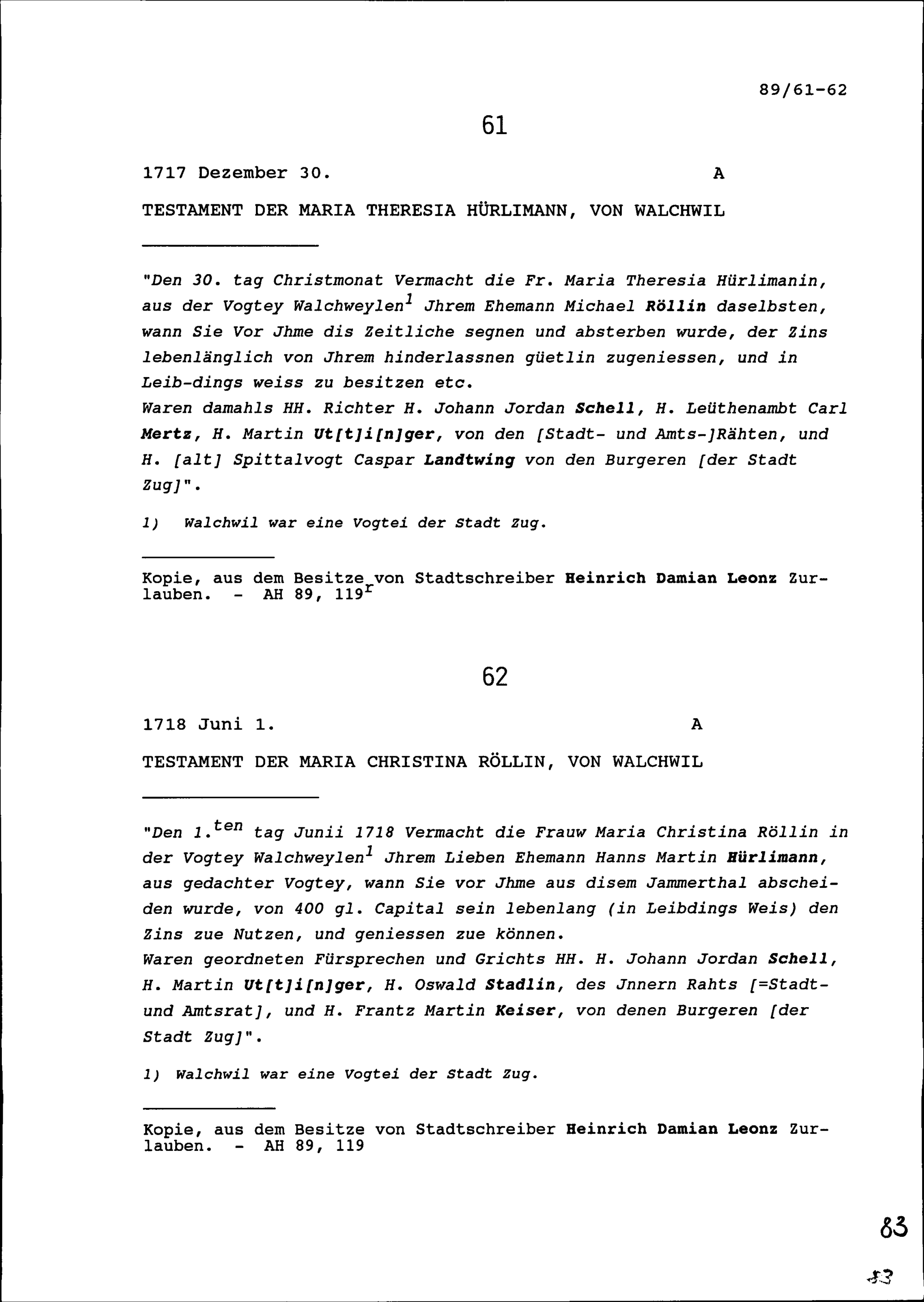 Testament der Maria Theresia Hürlimann, von Walchwil