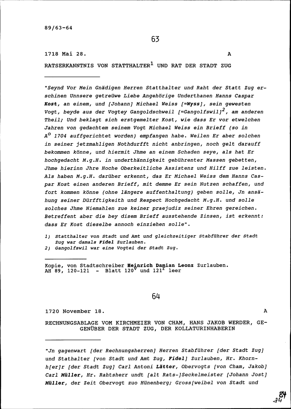 Ratsbeschluss des Statthalters und Rats der Stadt Zug