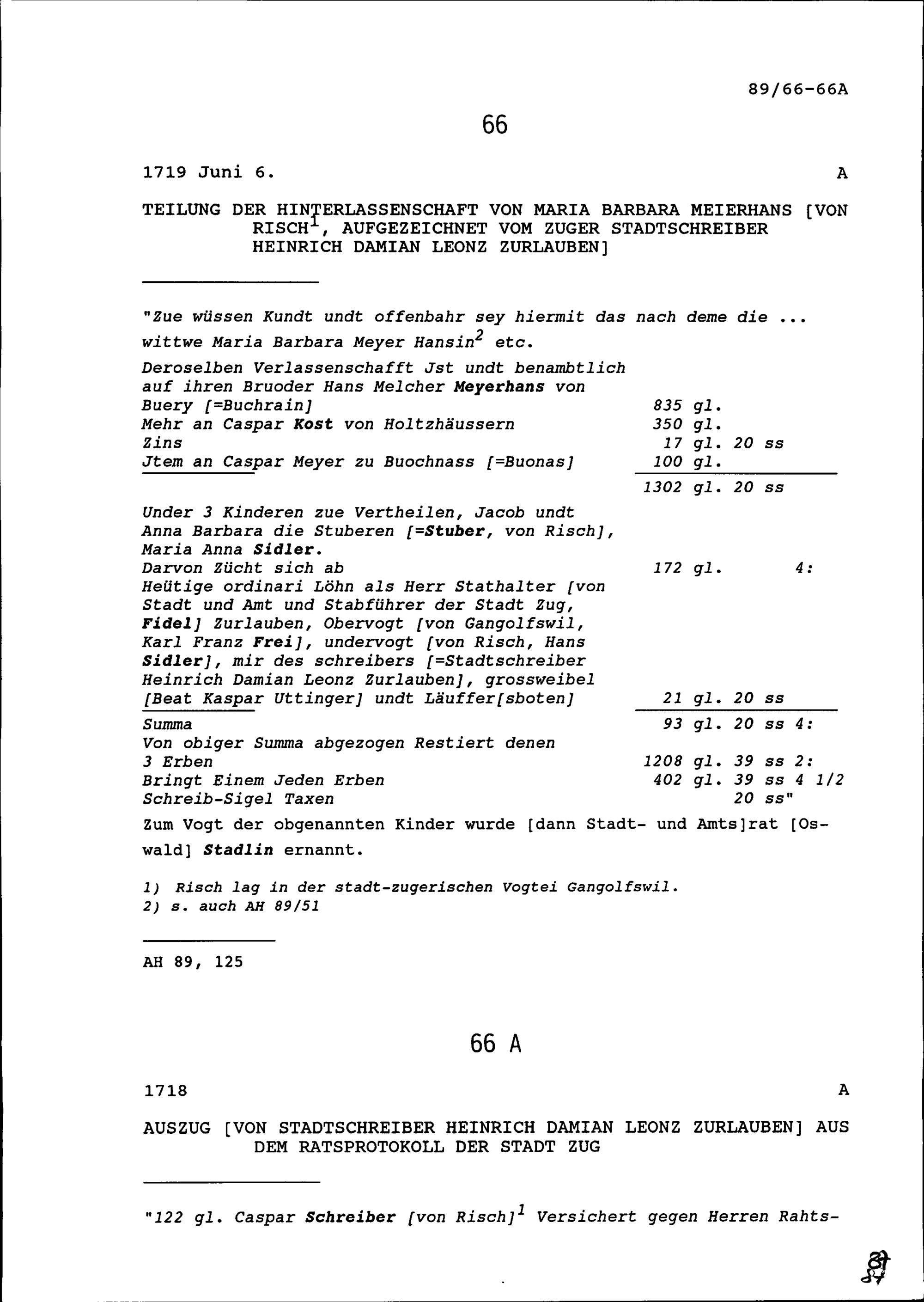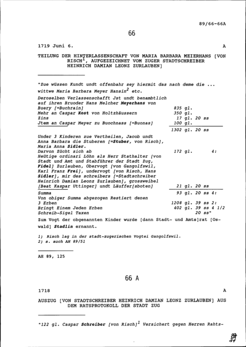 Teilung der Hinterlassenschaft von Maria Barbara Meierhans von Risch, aufgezeichnet von Heinrich Damian Leonz Zurlauben, Zuger Stadtschreiber