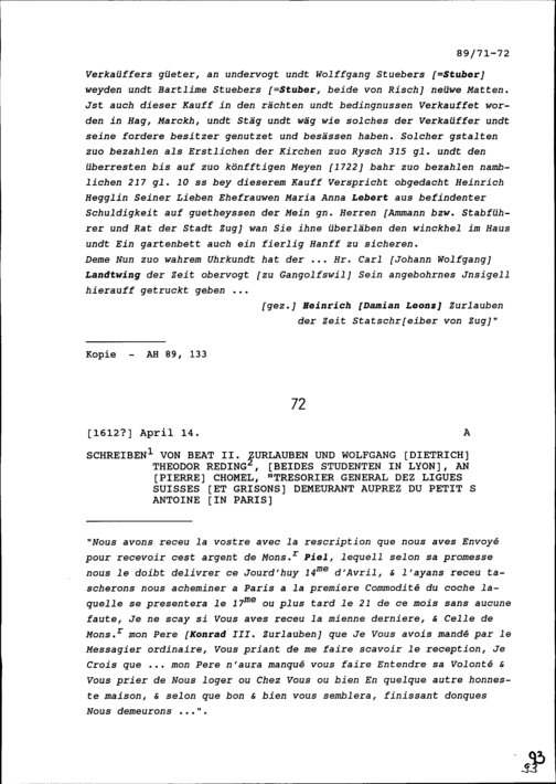 Schreiben von Beat II. Zurlauben und von Wolfgang Dietrich Theodor Reding, beide Studenten in Lyon, an Pierre Chomel, Zahlmeister der Schweizer und Bündner Truppen, Paris