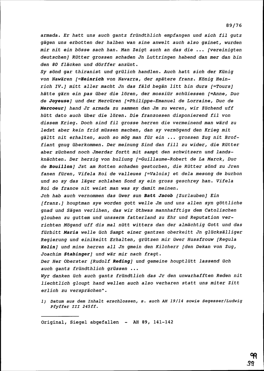 Schreiben von Hans Jakob Stocker, Hauptmann, an Beat I. Zurlauben, Ammann, Zug