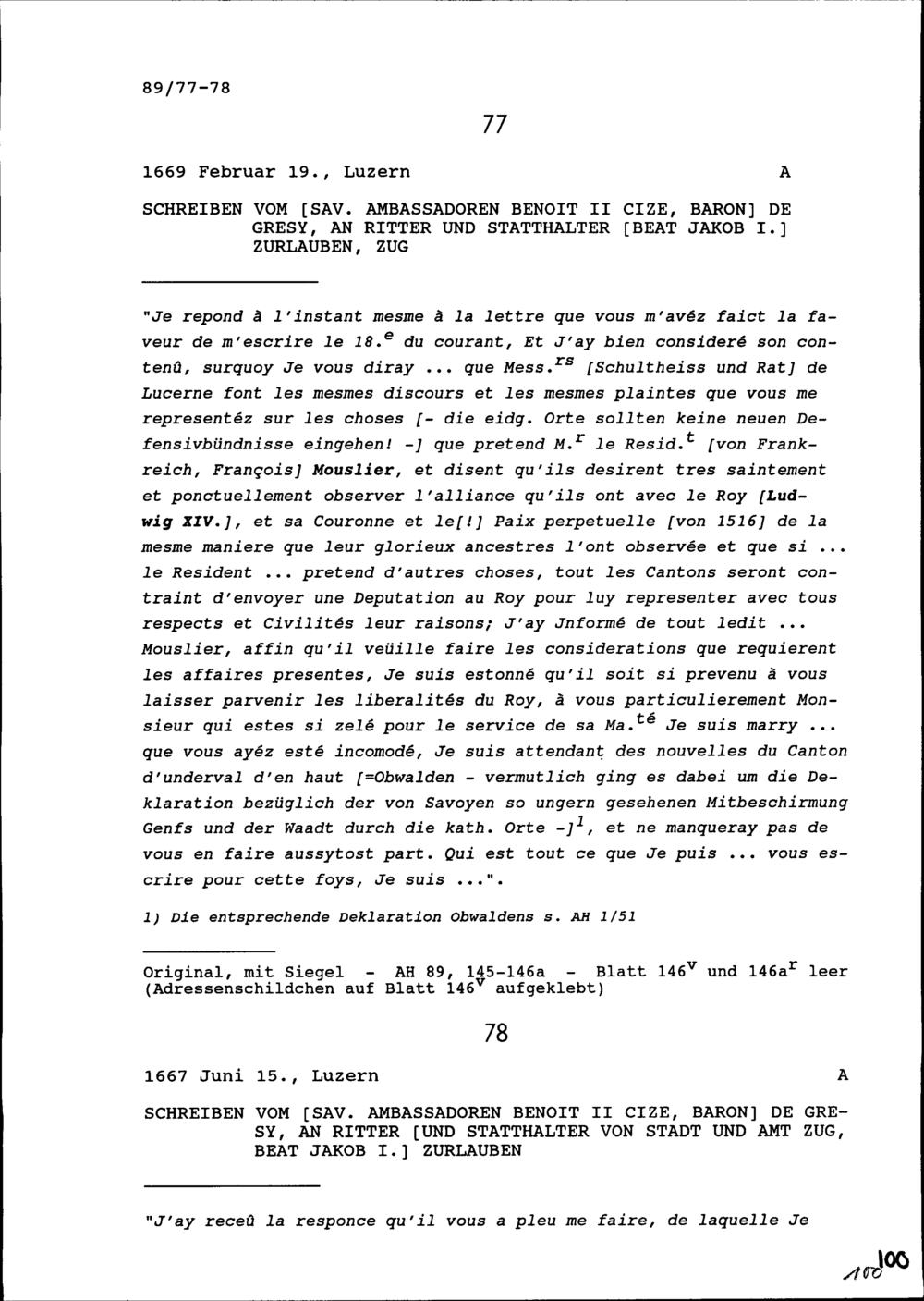 Schreiben von Benoît II. Cize, Baron de Grésy, Ambassador von Frankreich, an Beat Jakob I. Zurlauben, Statthalter, Zug