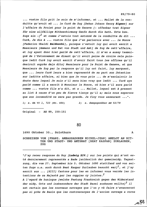 Schreiben von Michel-Jean Amelot, Ambassador von Frankreich, an Beat Kaspar Zurlauben,...