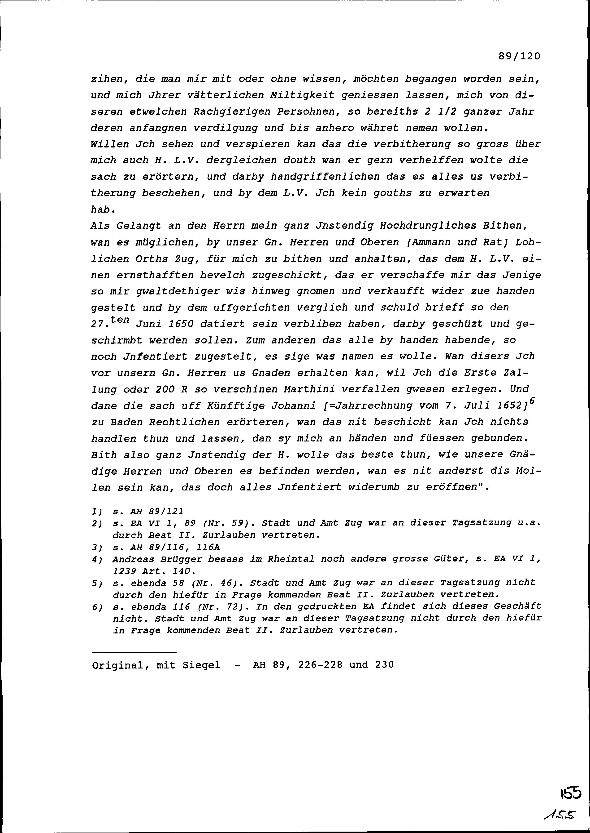 Schreiben von Lorenz Bärlocher, Altstadtschreiber von Rheineck, an Beat II. Zurlauben, Altammann und Stadt- und Amtrat, Zug