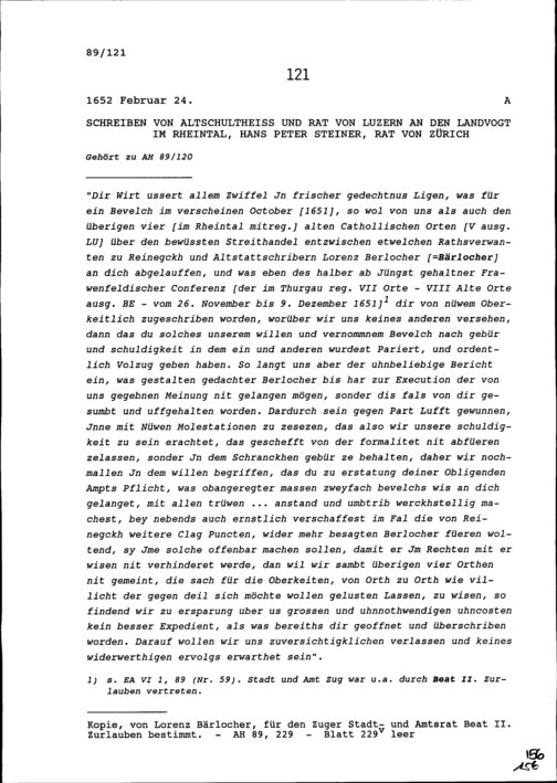Schreiben von Hans Peter Steiner, AltSchultheiss und Rat Luzern an Landvogt im Rheintal...