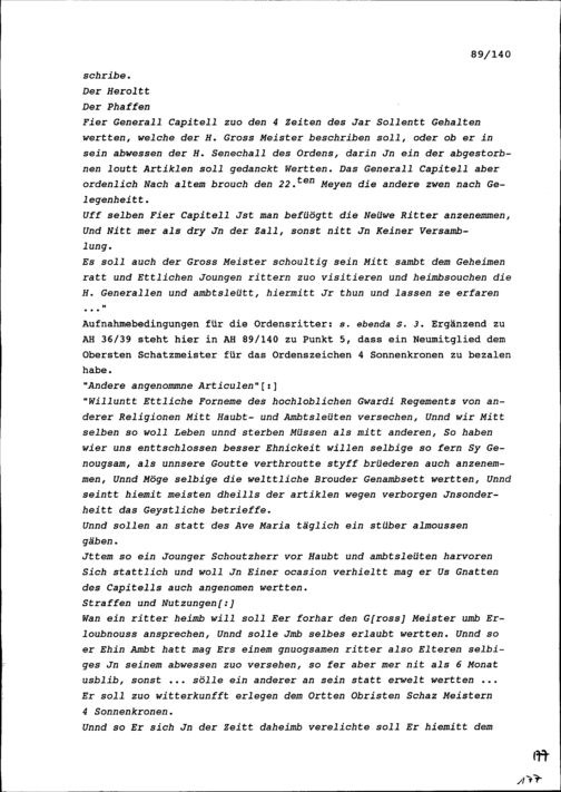 Gründungsgeschichte und Satzungen der Ritterschaft von der Runden Tafel, geschrieben von Heinrich I. Zurlauben, Gardeleutnant