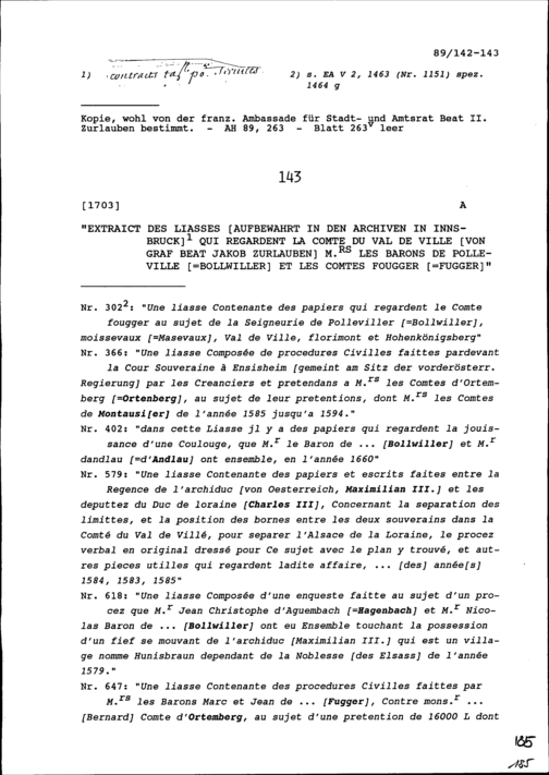 Auszüge aus Aktenbündel der Archive in Innsbruck zu Beat Jakob Zurlauben, zu Bollwiller und zu Fugger
