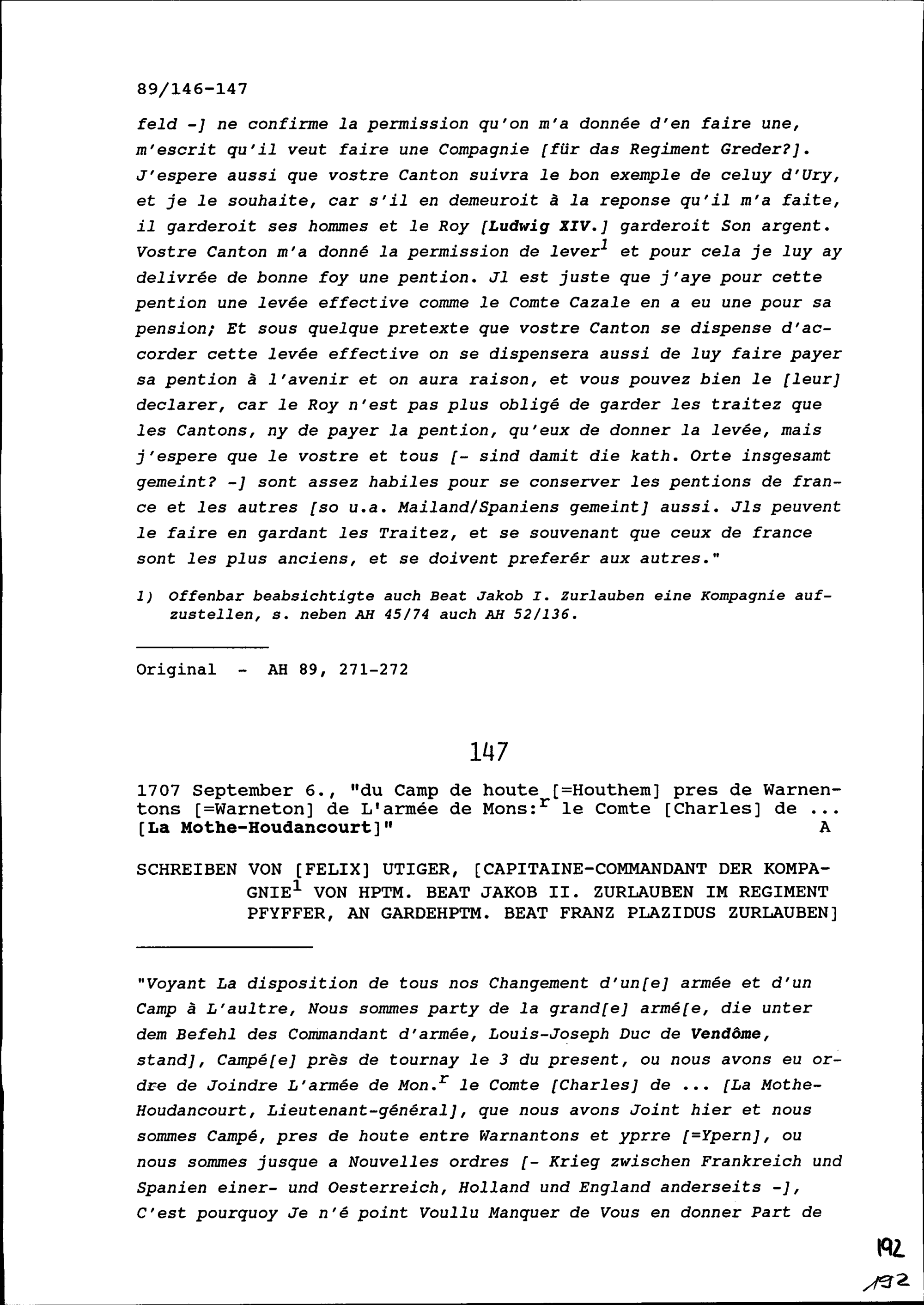Schreiben von Felix Utiger, Kommandant der Kompanie von Beat Jakob II. Zurlauben,...