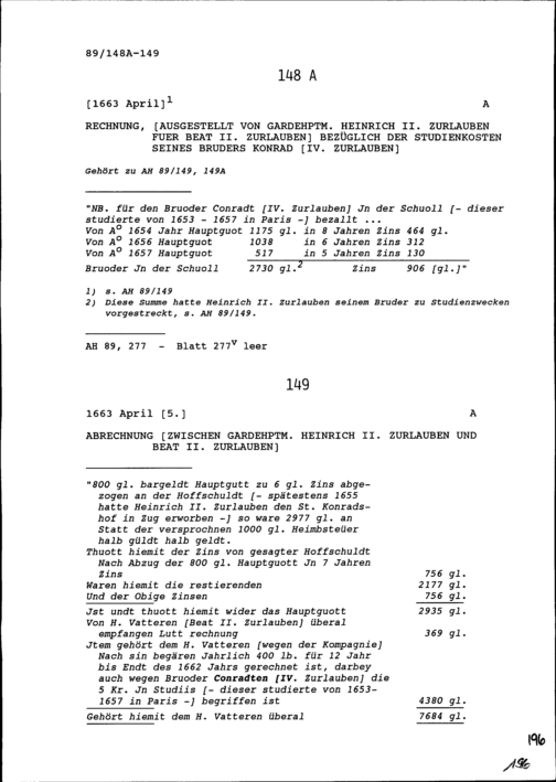 Rechnung für Beat II. Zurlauben bezüglich der Studienkosten seines Bruders Konrad IV. Zurlauben, ausgestellt von Heinrich II. Zurlauben, Gardehauptmann