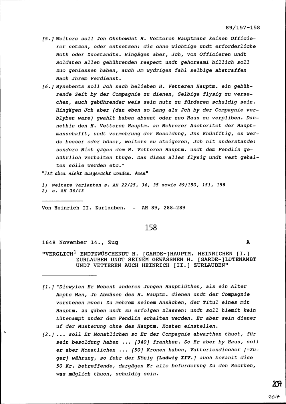Vergleich zwischen Heinrich I. Zurlauben Gardehauptmann, und Heinrich II. Zurlauben,...