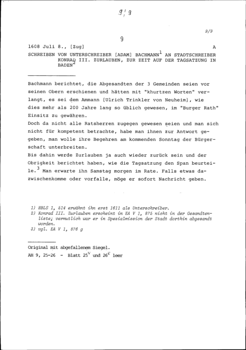 Schreiben von Adam Bachmann, Unterschreiber, an Konrad III. Zurlauben, Stadtschreiber, zur Zeit auf der Tagsatzung in Baden