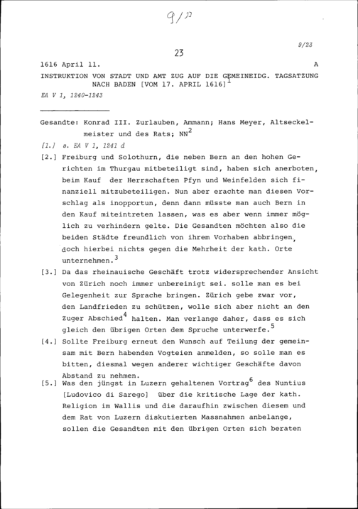 Instruktion von Stadt und Amt Zug auf die Tagsatzung in Baden vom 17. April 1616