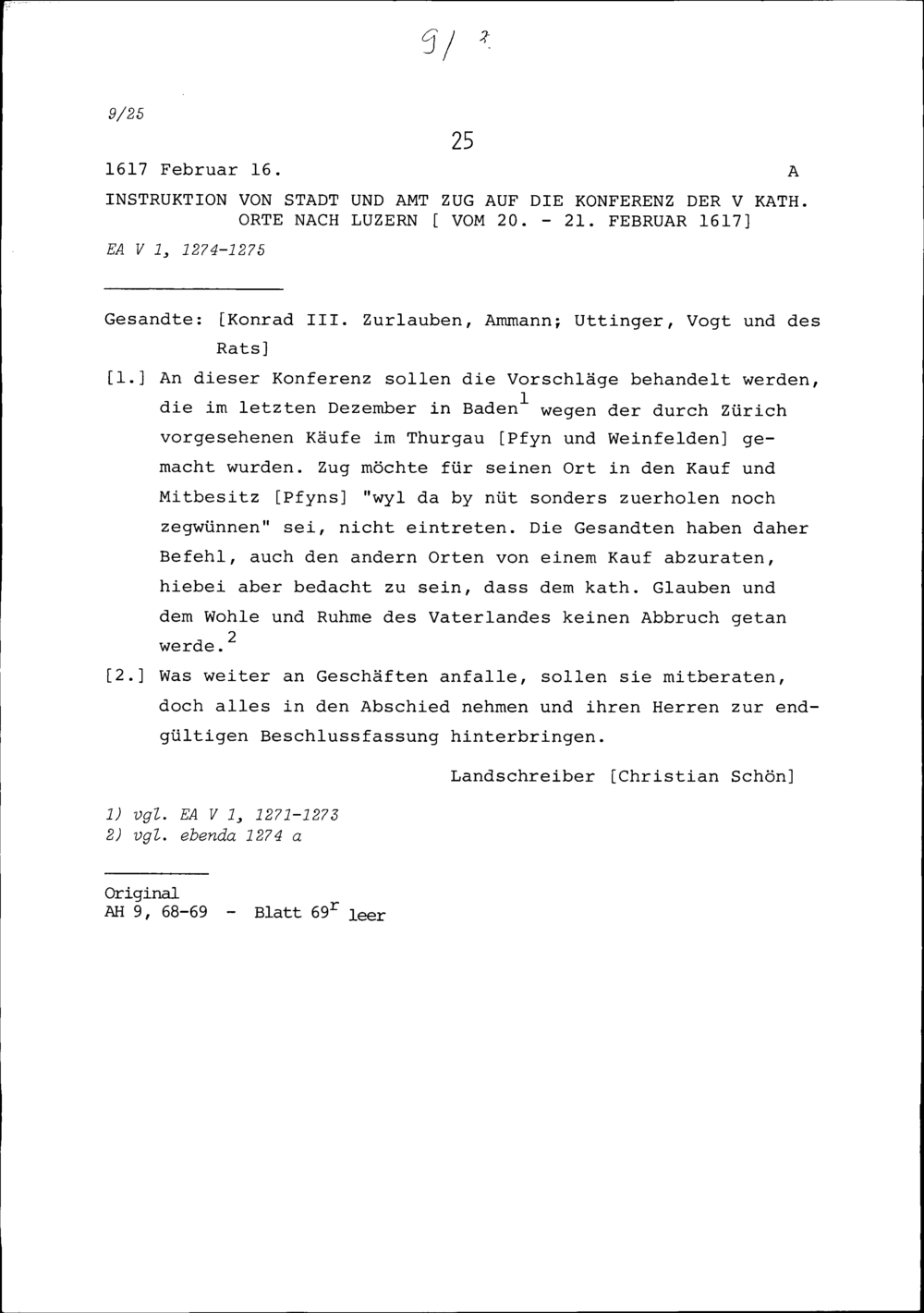 Instruktion von Stadt und Amt Zug auf die Konferenz der Fünf Katholischen Orte in Luzern vom 20. bis 21. Februar 1617
