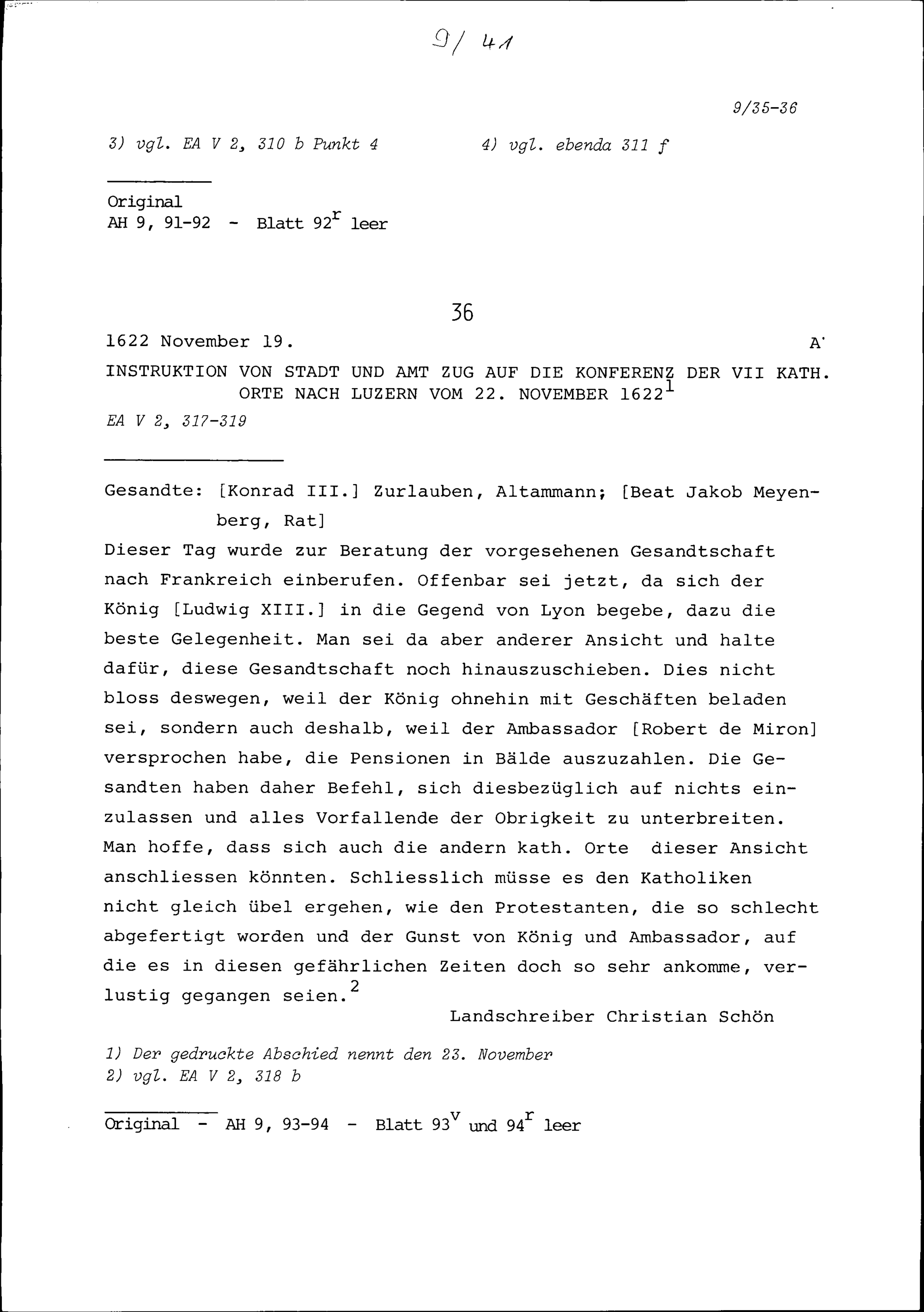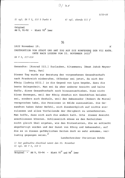 Instruktion von Stadt und Amt Zug auf die Konferenz der Sieben Katholischen Orte in Luzern vom 22. November 1622