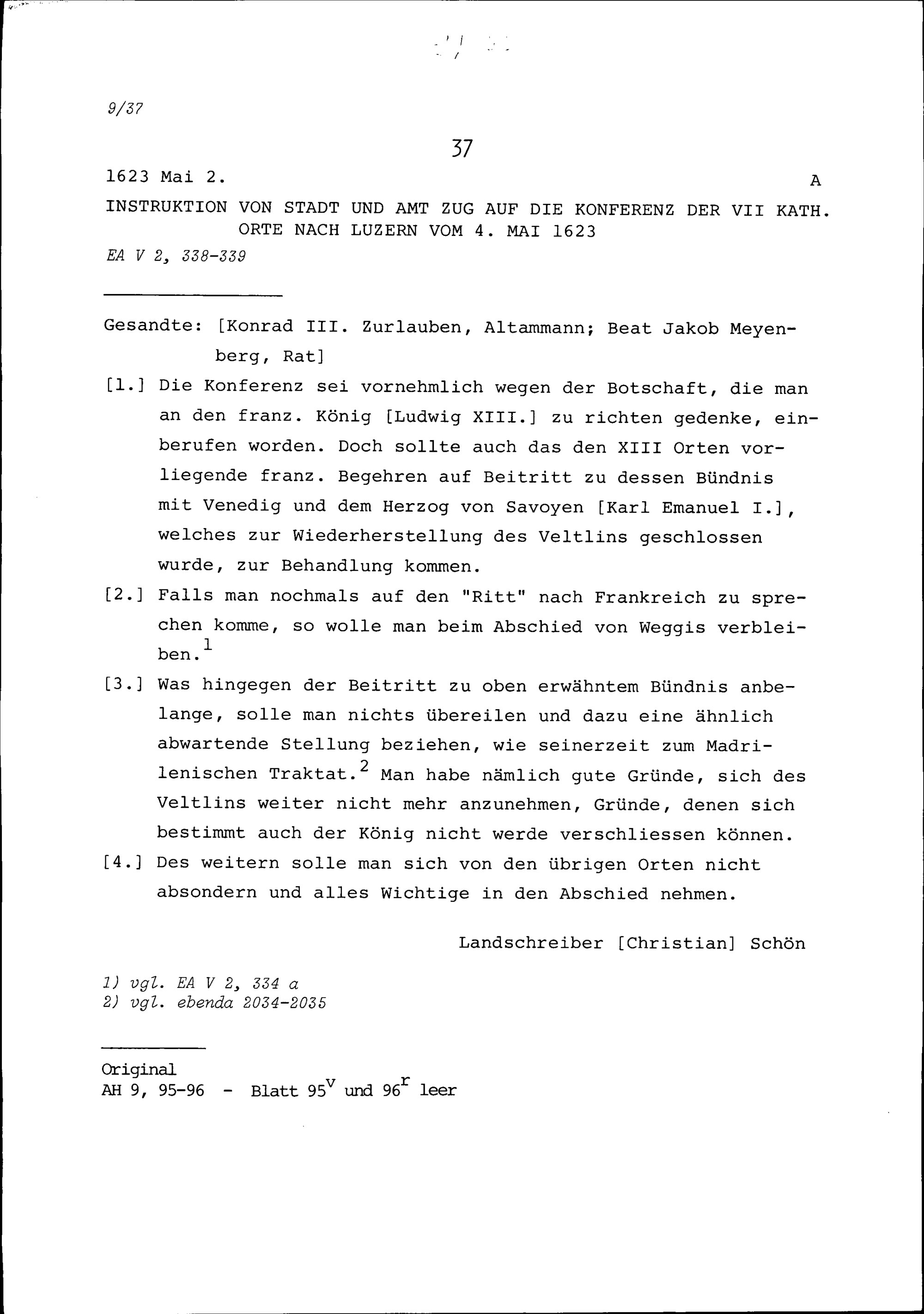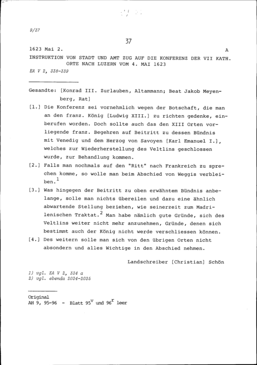 Instruktion von Stadt und Amt Zug auf die Konferenz der Sieben Katholischen Orte in Luzern vom 4. Mai 1623