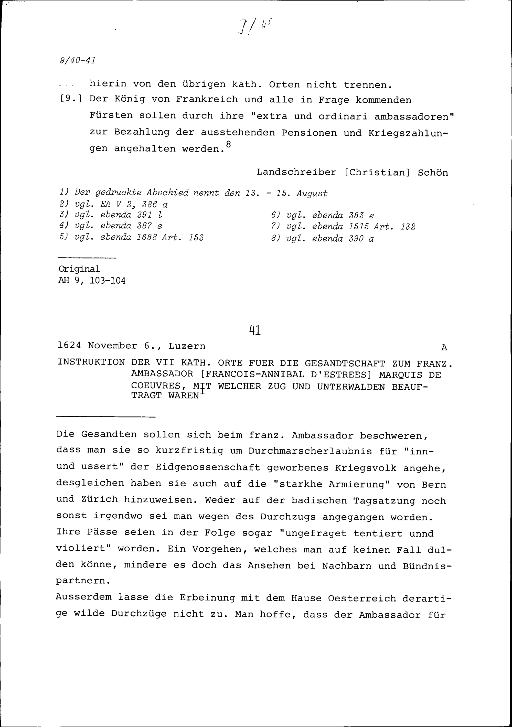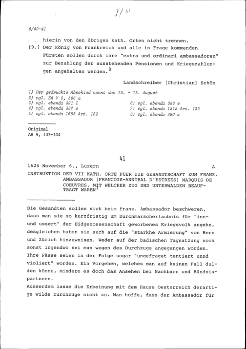 Instruktion der Sieben Katholischen Orte für die Gesandtschaft zu François-Annibal d'Estrées, Marquis de Coeuvres, Ambassador von Frankreich, mit welcher Zug und Unterwalden beauftragt waren