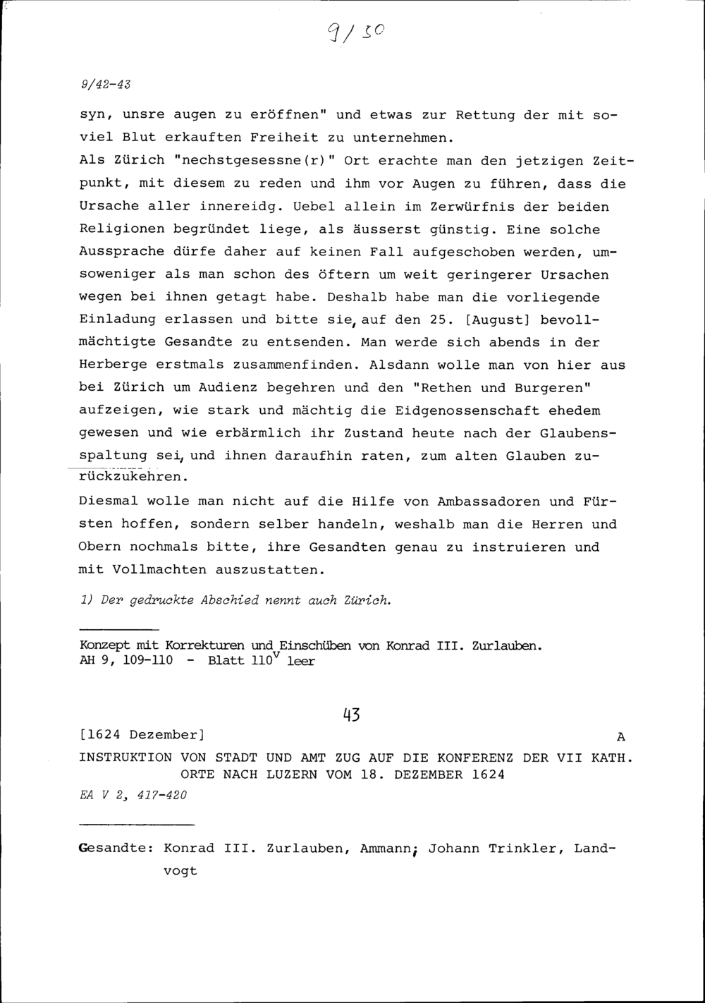 Instruktion von Stadt und Amt Zug auf die Konferenz der Sieben Katholischen Orte in Luzern vom 18. Dezember 1624