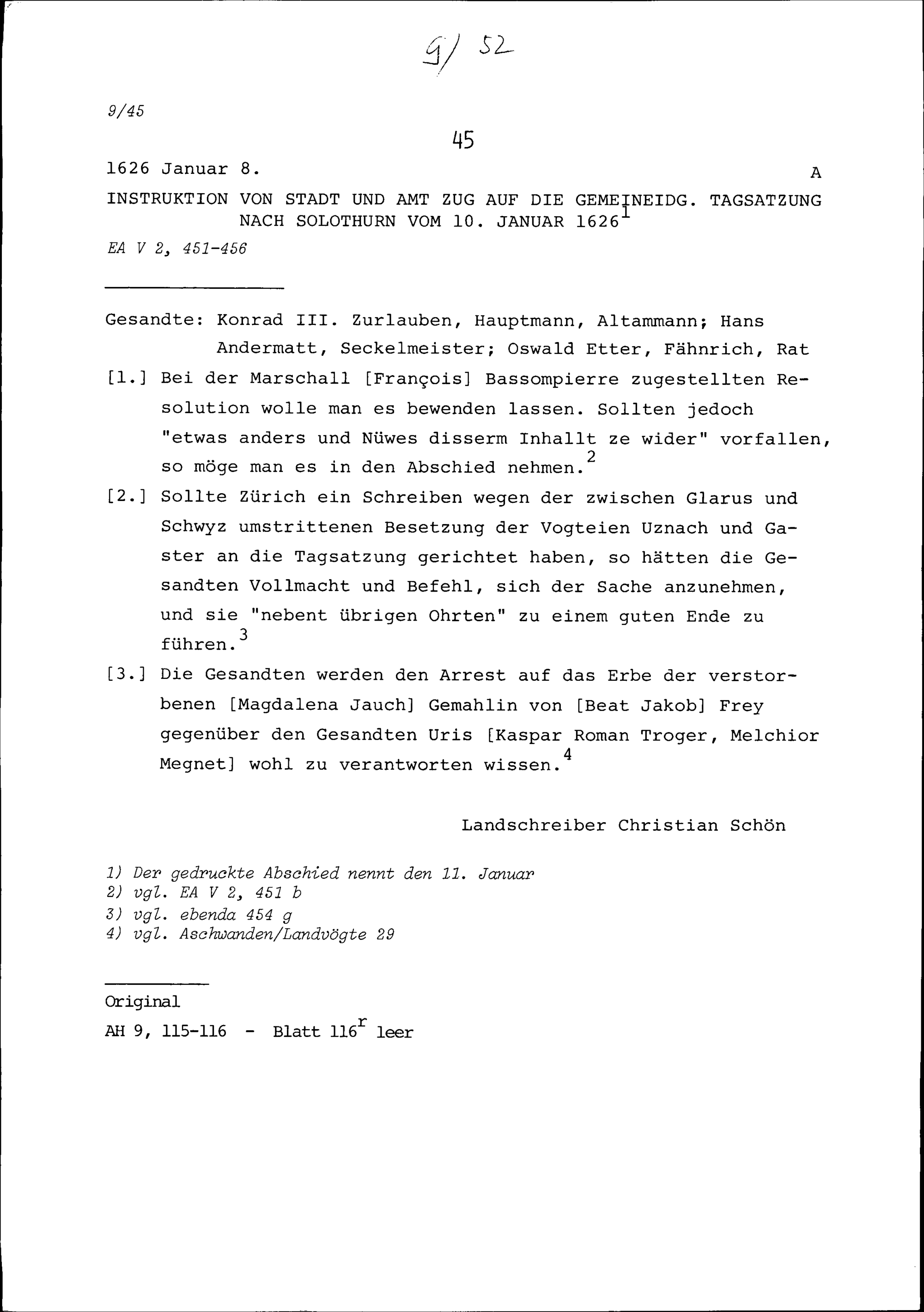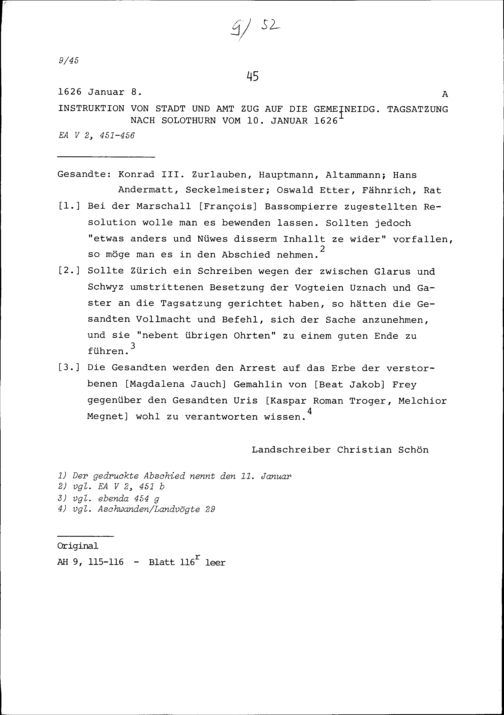 Instruktion von Stadt und Amt Zug auf die Tagsatzung in Solothurn vom 10. Januar 1626