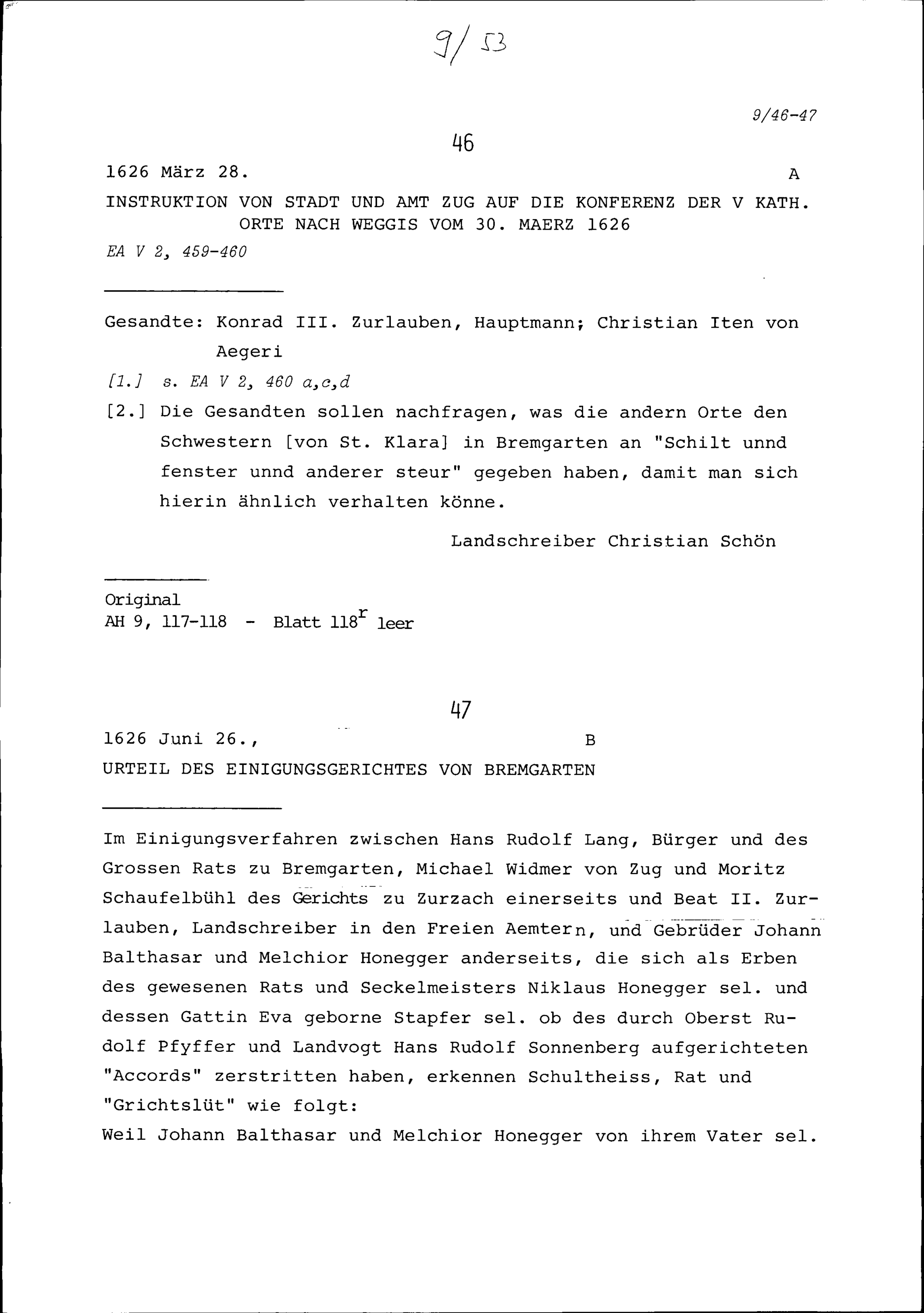 Instruktion von Stadt und Amt Zug auf die Konferenz der Fünf Katholischen Orte in Weggis vom 30. März 1626
