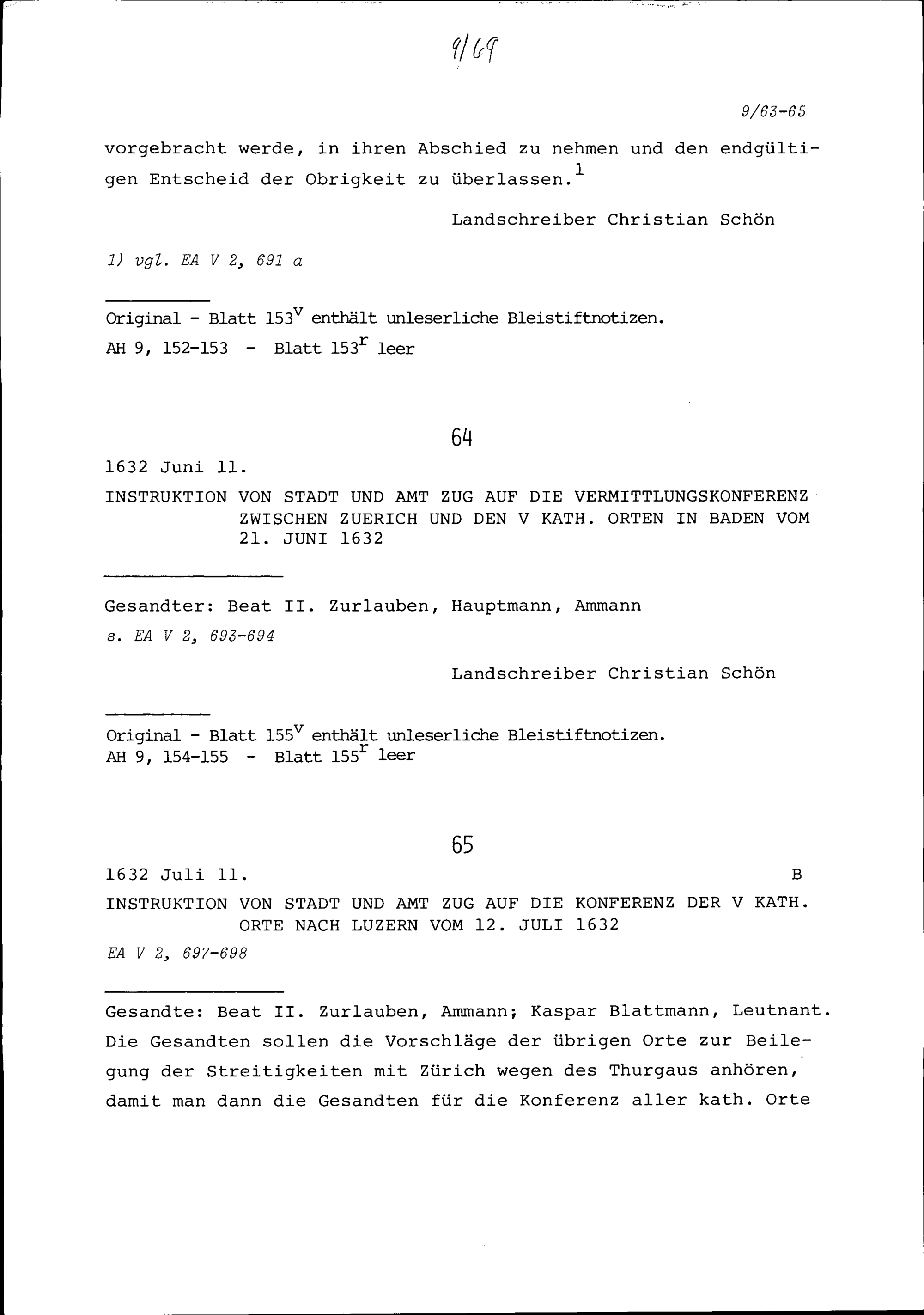Instruktion von Stadt und Amt Zug auf die Vermittlungskonferenz zwischen Zürich und den Fünf Katholischen Orten in Baden vom 21. Juni 1632