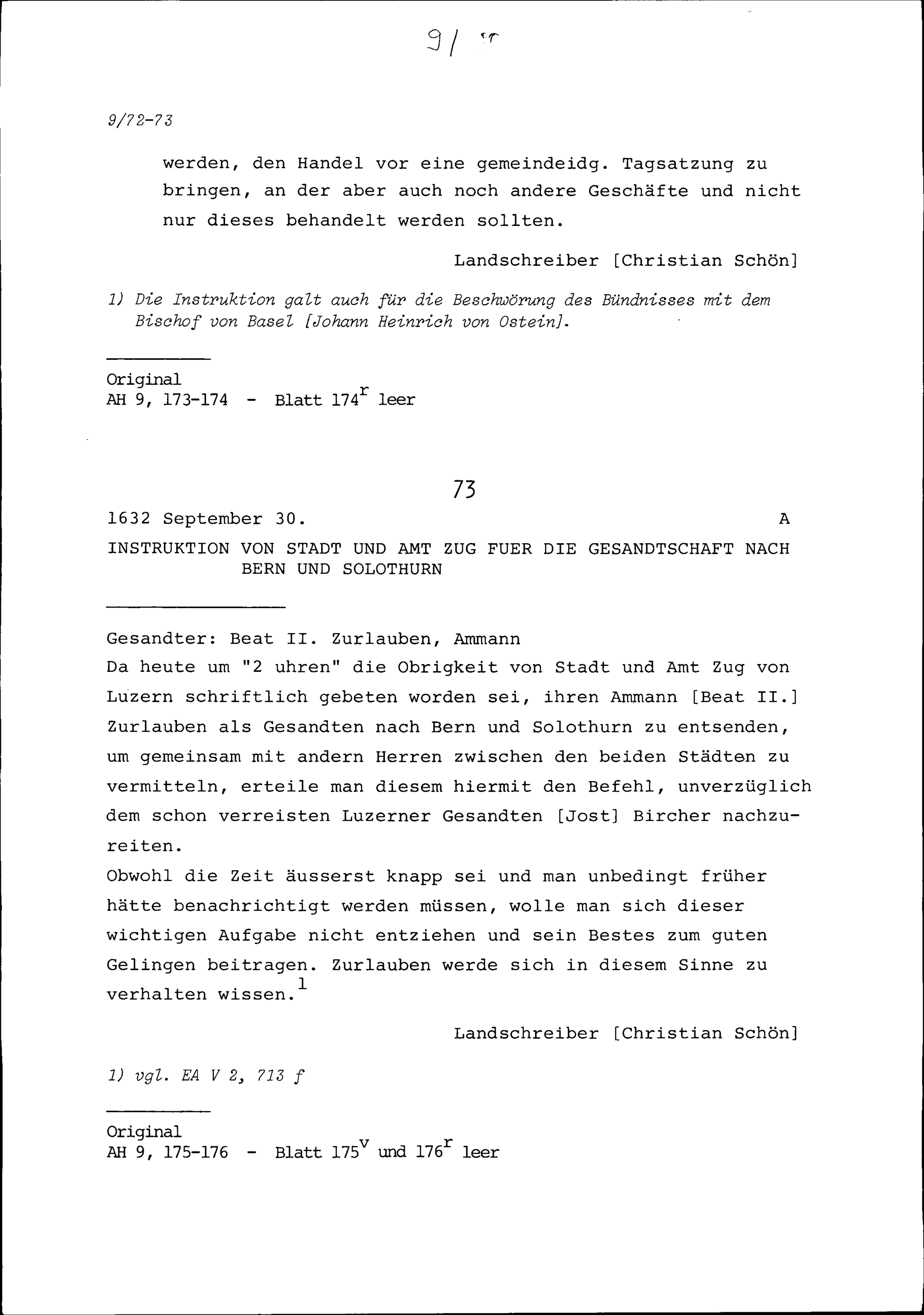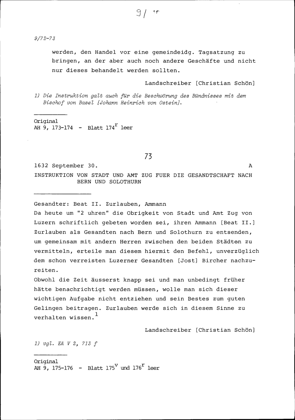 Instruktion von Stadt und Amt Zug für die Gesandtschaft nach Bern und Solothurn