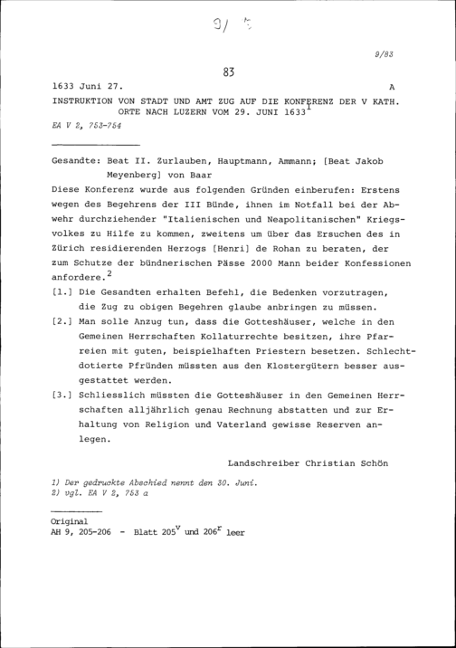 Instruktion von Stadt und Amt Zug auf die Konferenz der Fünf Katholischen Orte in Luzern vom 29. Juni 1633