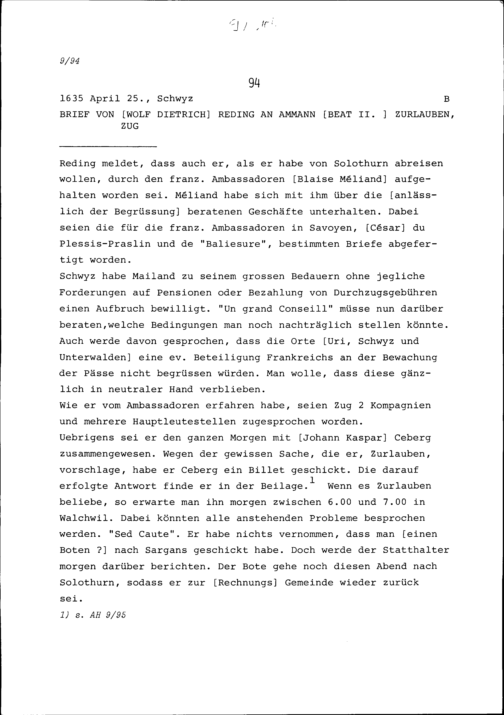 Schreiben von Wolf Dietrich Reding an Beat II. Zurlauben, Ammann, Zug