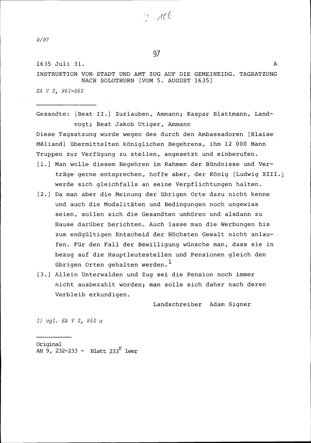 Instruktion von Stadt und Amt Zug auf die Tagsatzung in Solothurn vom 5. August 1635