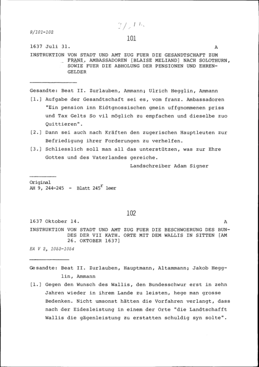 Instruktion von Stadt und Amt Zug für die Gesandtschaft zu Blaise Méliand, Ambassador von Frankreich, nach Solothurn, sowie für die Abholung der Pensionen und Ehrengelder