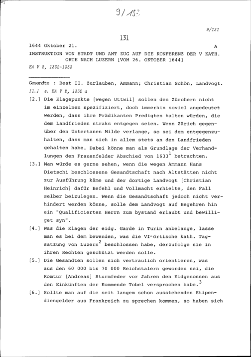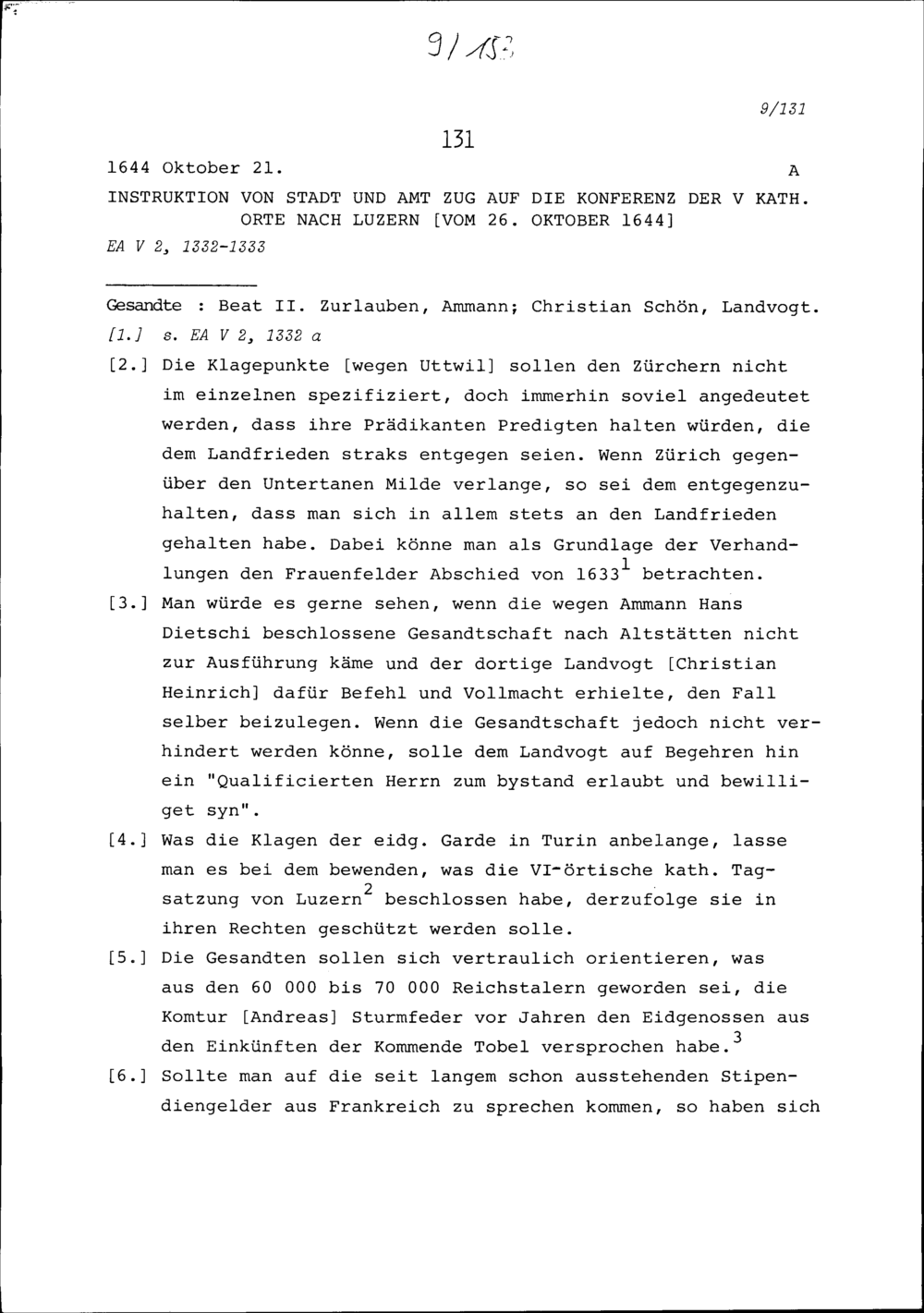 Instruktion von Stadt und Amt Zug auf die Konferenz der Fünf Katholischen Orte in Luzern vom 26. Oktober 1644