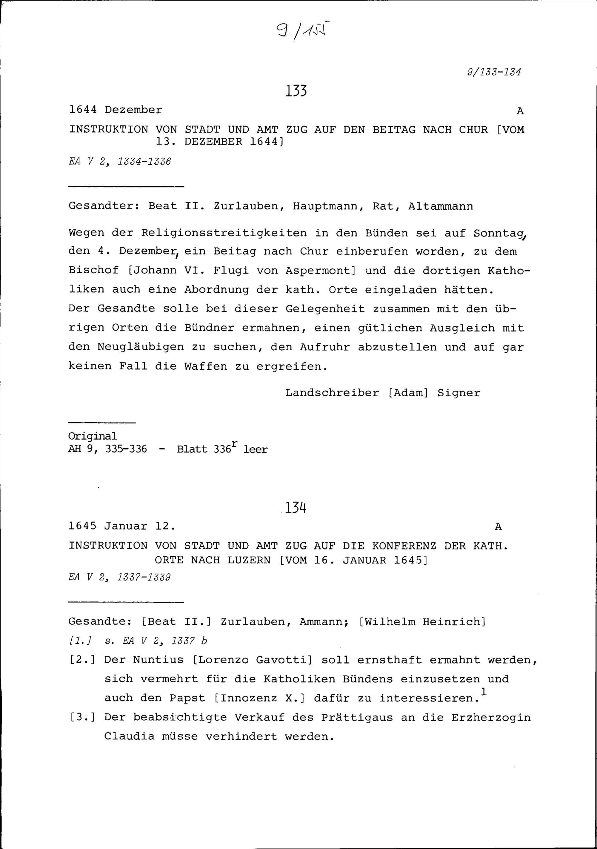 Instruktion von Stadt und Amt Zug auf den Beitag in Chur vom 13. Dezember 1644
