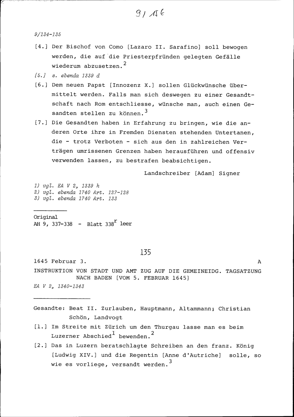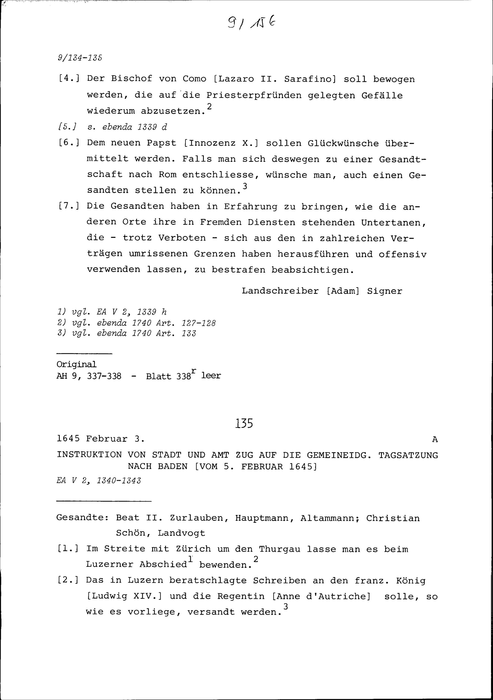 Instruktion von Stadt und Amt Zug auf die Tagsatzung in Baden vom 5. Februar 1645
