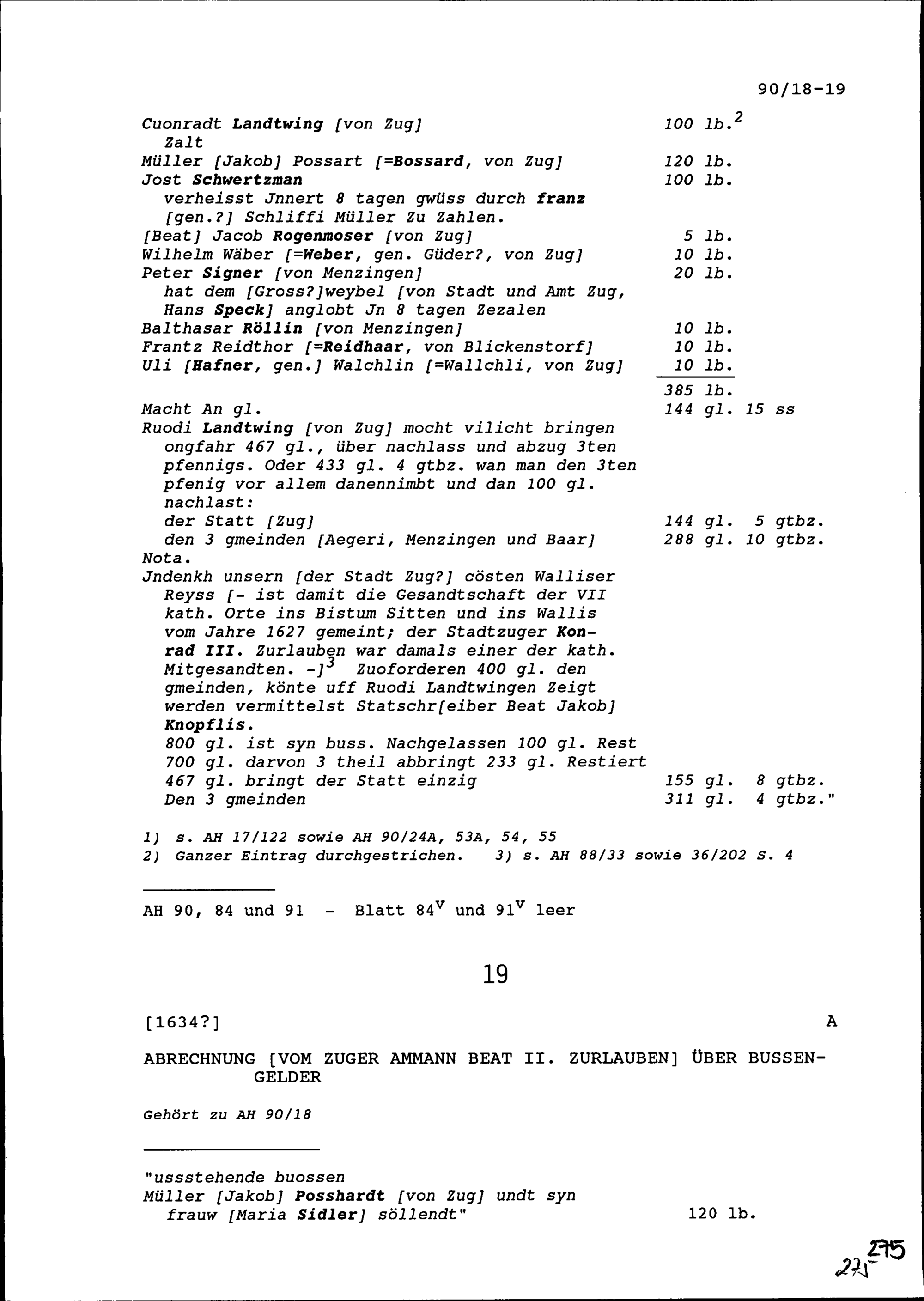 Abrechnung von Beat II. Zurlauben, Ammann Zug, über Bussengelder