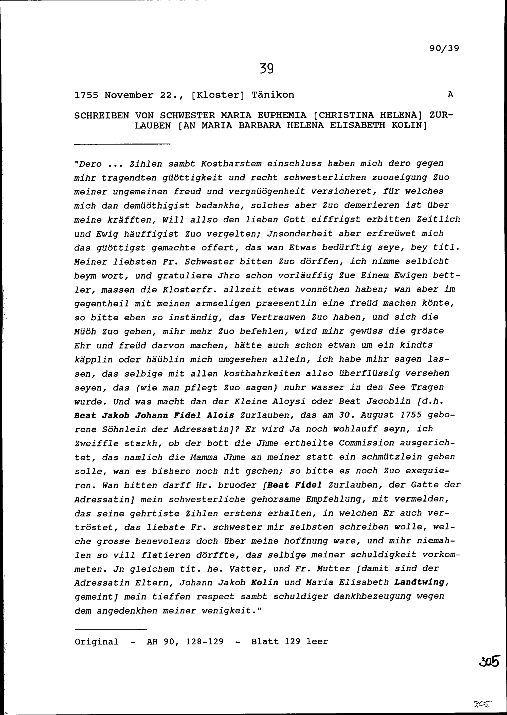 Schreiben von Maria Euphemia Christina Helena Zurlauben, Klosterfrau in Tänikon, an Maria Barbara Helena Elisabeth Kolin
