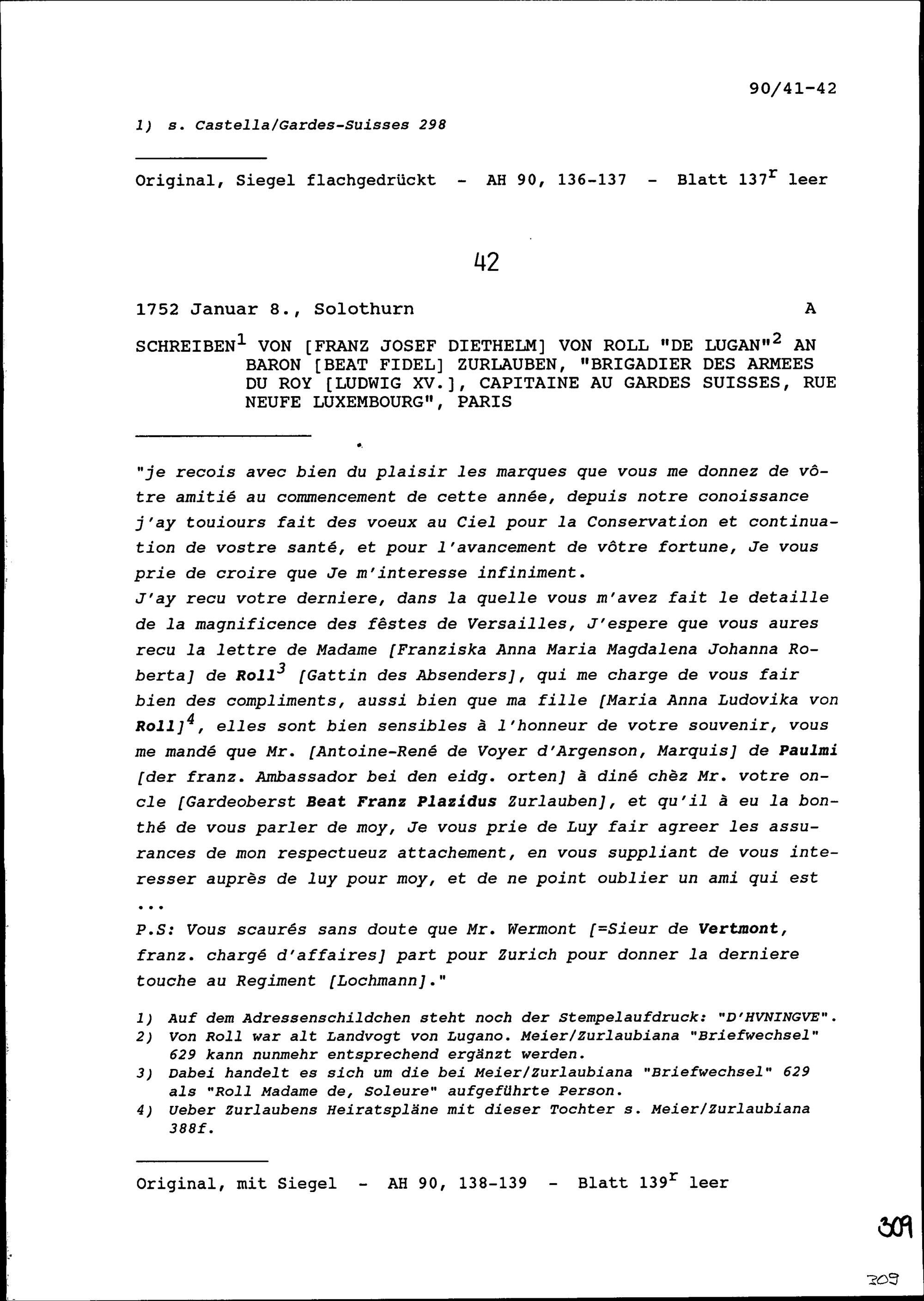 Schreiben von Franz Josef Diethelm von Roll, Altlandvogt von Lugano, an Beat Fidel Zurlauben, Brigadier, Paris