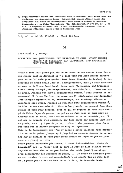 Schreiben von Josef Nazar Reding von Biberegg, Gardehauptmann und Feldmarschall, an Beat Fidel Zurlauben, Gardehauptmann und Brigadier