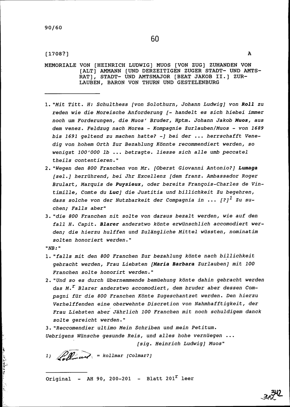 Bericht von Heinrich Ludwig Muos von Zug zuhanden von Beat Jakob II. Zurlauben, Altammann und Stadt- und Amtrat Zug und Amtmajor