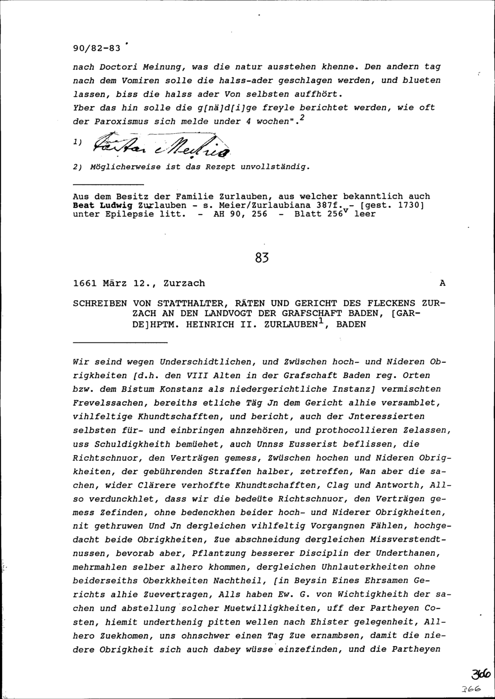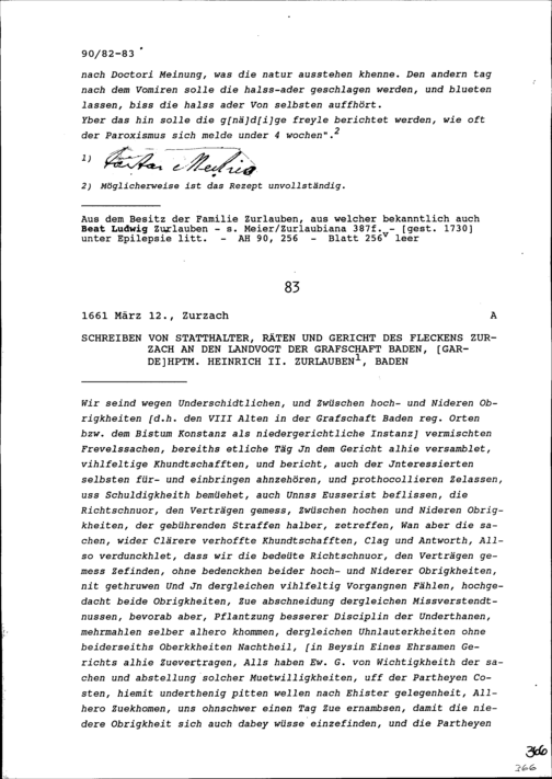 Schreiben des Statthalters, der Räte und des Gericht des Fleckens Zurzach an Heinrich II. Zurlauben, Landvogt der Grafschaft Baden und Gardehauptmann, Baden