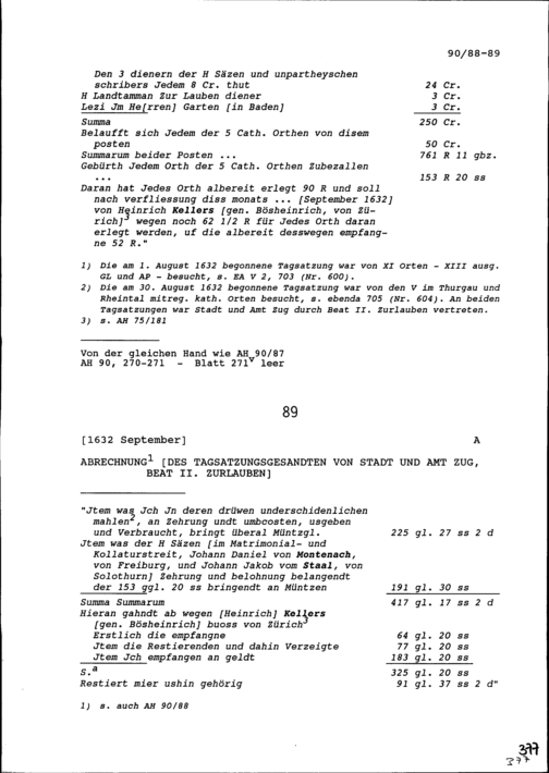 Abrechnung von Beat II. Zurlauben, Tagsatzungsgesandter von Stadt und Amt Zug