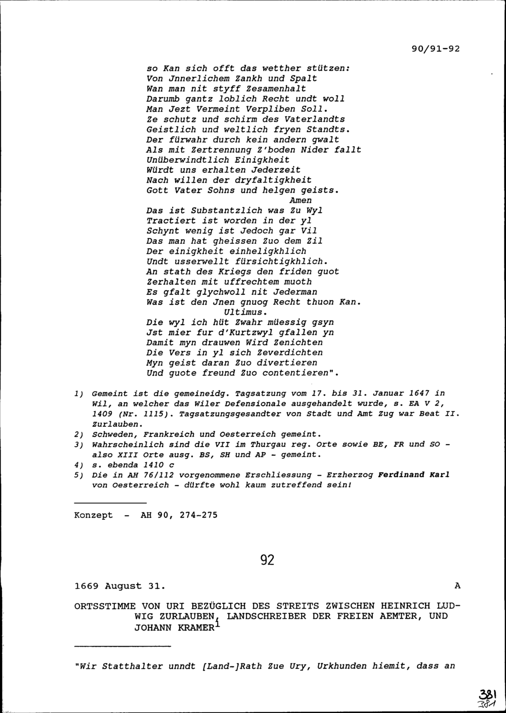 Ortsstimme Uris bezüglich des Streits zwischen Heinrich Ludwig Zurlauben, Landschreiber der Freien Ämter, und Johann Kramer