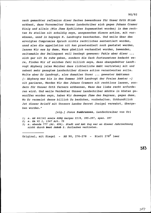Ortsstimme Uris bezüglich des Streits zwischen Heinrich Ludwig Zurlauben, Landschreiber der Freien Ämter, und Johann Kramer