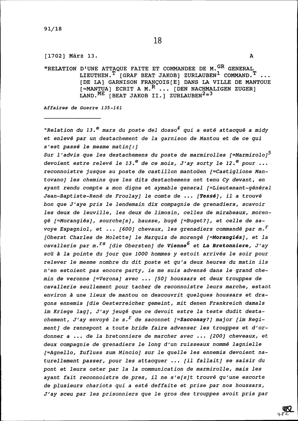 Bericht über einen Angriff unter Beat Jakob Zurlauben, Generalleutnant, Mantua, aufgezeichnet von Beat Jakob II. Zurlauben