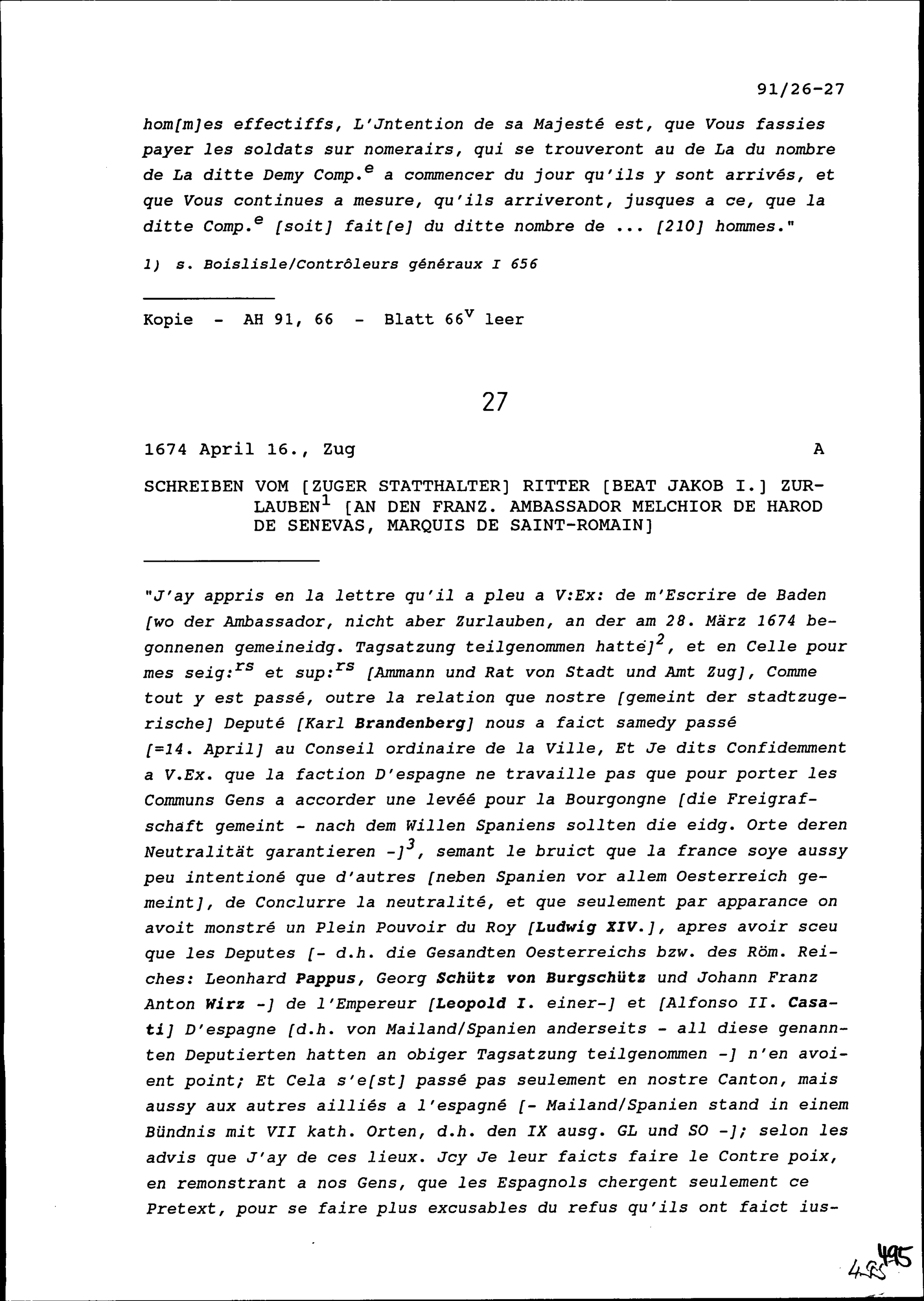 Schreiben von Beat Jakob I. Zurlauben, Statthalter Zug, an Melchior de Harod de Senevas, Marquis de Saint-Romain, Ambassador von Frankreich
