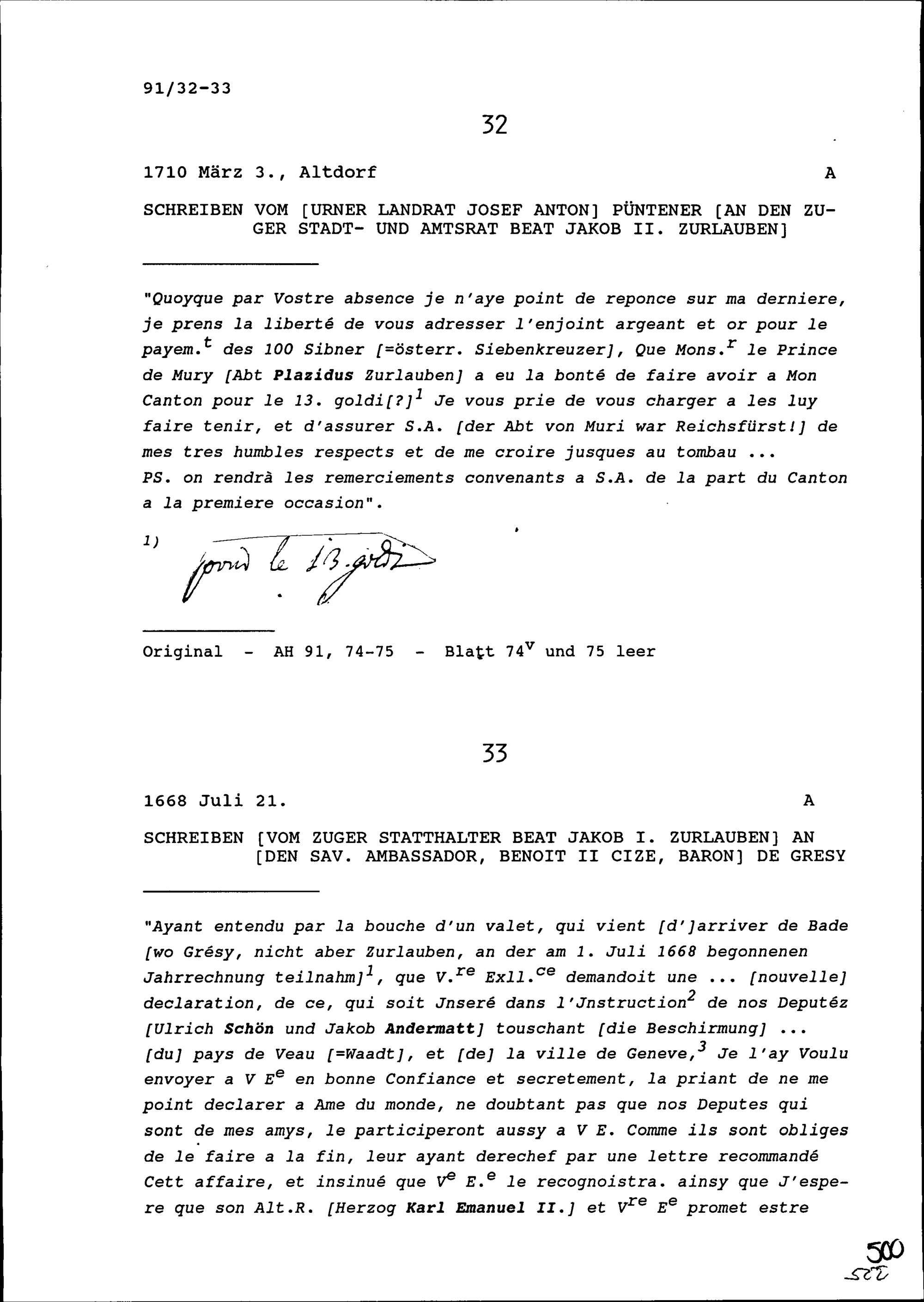 Schreiben von Josef Anton Püntener, Landrat Uri, an Beat Jakob II. Zurlauben, Stadt- und Amtrat Zug