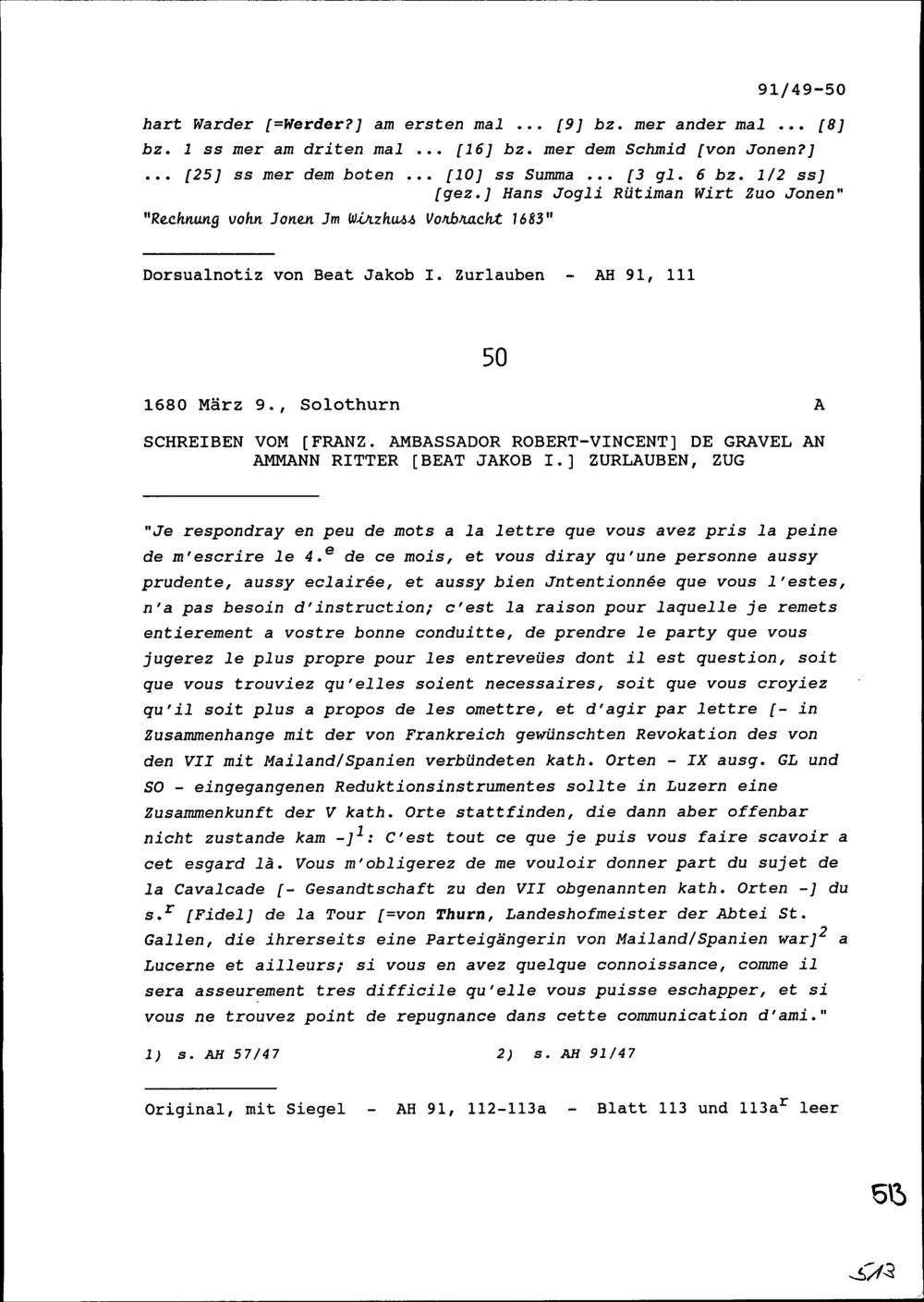 Schreiben von Robert-Vincent de Gravel, Ambassador von Frankreich, an Beat Jakob I. Zurlauben, Ammann, Zug