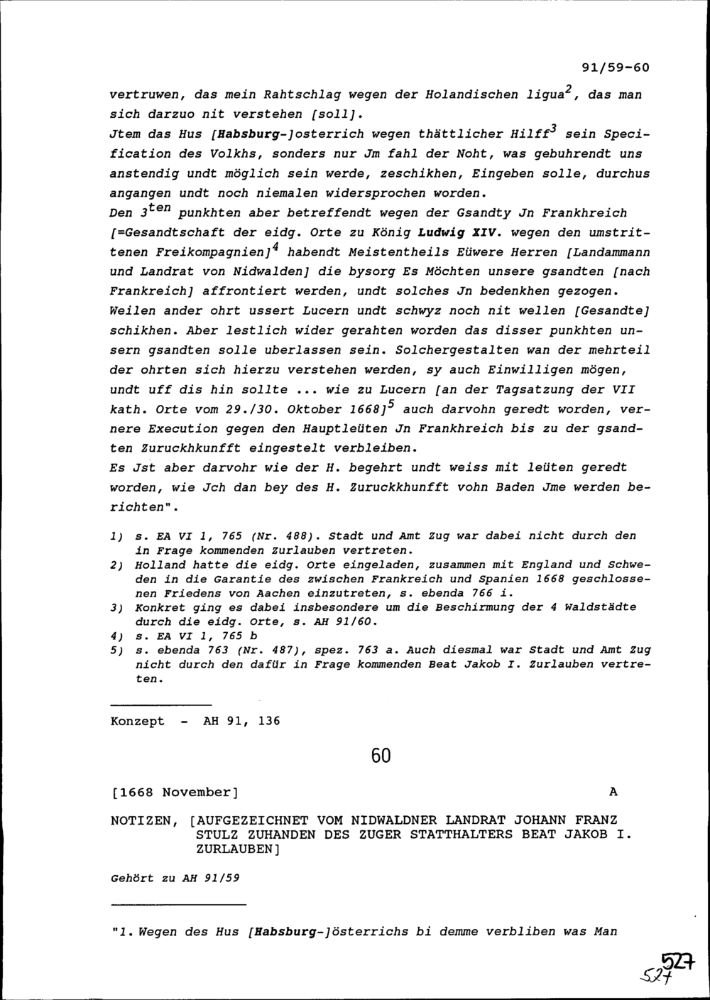 Notiz, aufgezeichnet von Johann Franz Stulz, Nidwaldner Landrat, zuhanden von Beat Jakob I. Zurlauben, Statthalter Zug