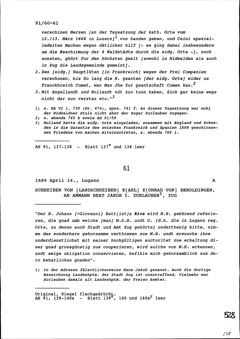 Schreiben von Karl Konrad von Beroldingen, Landschreiber, an Beat Jakob I. Zurlauben, Ammann, Zug